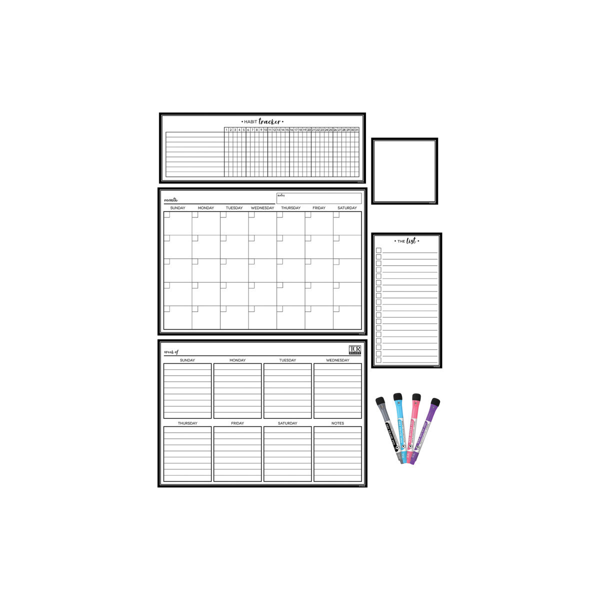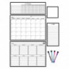 Keep track of important dates, activities, and tasks with this write-on/wipe-off dry-erase magnetic calendar set. Organize your busy schedule by filling in the monthly and weekly calendar charts. Use the habit tracker to stay on top of daily routines like exercising and practicing a skill. For notes and reminders, use the list or the square note to keep track of what you need or quickly get your point across. Use on refrigerators, whiteboards, lockers, metal desks, metal shelves and more. Includes 4 dry-erase pens in black, blue, pink, and purple. This set includes 17" x 12" monthly calendar, 17" x 12" weekly calendar, 16.75" x 5.75" habit tracker, 5.75" x 11" list, and 5.425" x 5.425" square note.