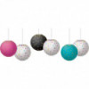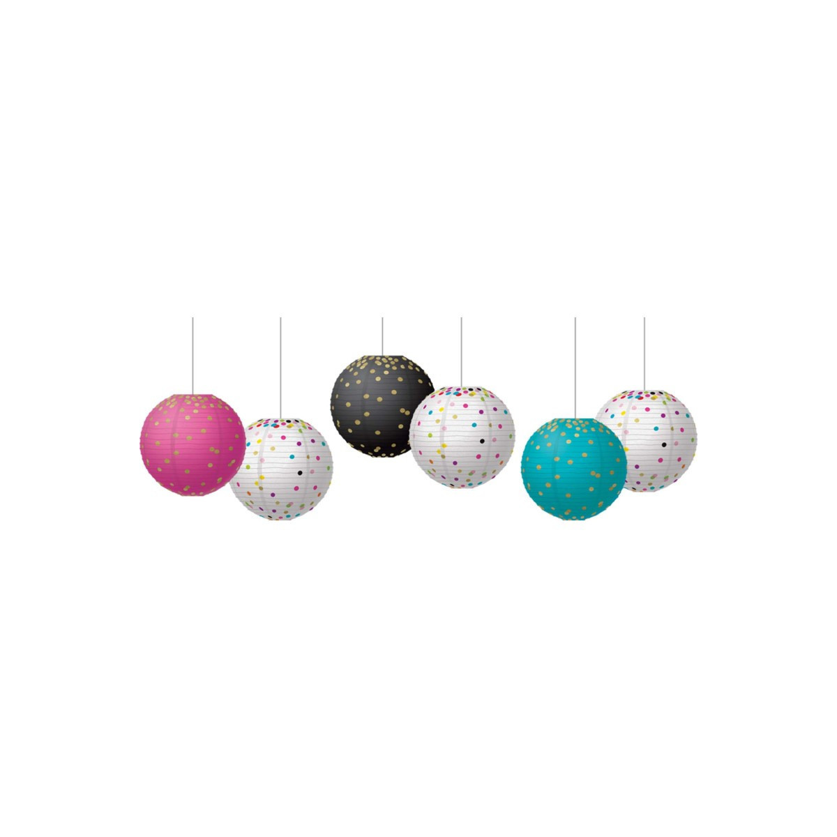 These colorful paper lanterns are great for adding a splash of color into your classroom. Coordinate with similar-patterned decoratives and popular color schemes to create the perfect look. Use them to fill up unused corners, hang accents off of them to organize work areas, or make a fun, inviting space for kids to learn. Each lantern is 8" in diameter. Each pack includes 6 lanterns: one each with gold foil dots on black, teal, and pink, and three multi-color confetti dots on white.