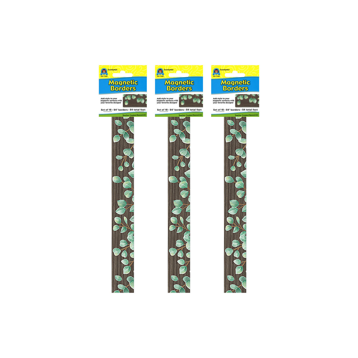 Decorate your whiteboard in a snap with these durable magnetic borders with a leafy green and wood-grain design. Add flair on other metal surface such as doors, desks, shelving, and bins. Cuts easily with scissors to make your own label or game pieces. Each magnetic border is 24" x 1-1/2". Each pack includes 12 pieces for a total of 24 feet. Sold as 3 packs for a total of 36 pieces (72 feet).