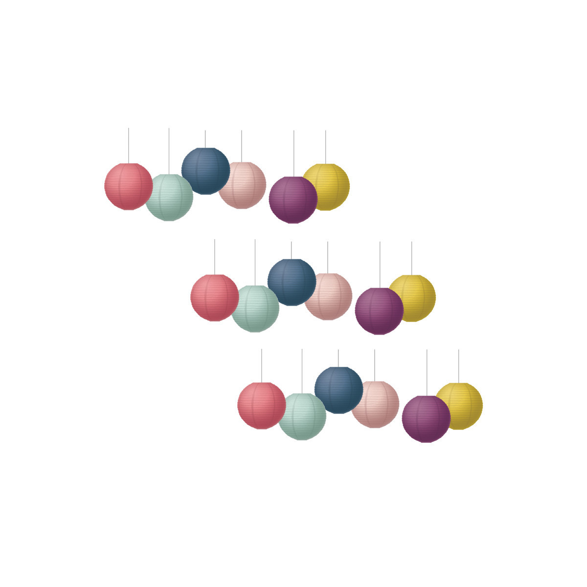 These colorful paper lanterns are great for adding a splash of color into your classroom. Coordinate with similar-patterned decoratives and popular color schemes to create the perfect look. Use them to fill up unused corners, hang accents off of them to organize work areas, or make a fun, inviting space for kids to learn. Each lantern is 8" in diameter. Each pack includes 6 lanterns: one each of slate blue, blush, coral pink, plum purple, mint, and yellow. Sold as 3 packs for a total of 18 lanterns.