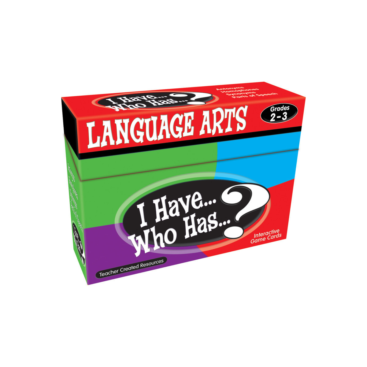 The entire class can have fun while practicing skills in language arts, grammar, vocabulary, spelling, listening, and speaking. Hand out all 37 cards. (Some players may get more than one card.) The student whose card reads, "I have the first card. Who has...?" begins. The student whose card has the answer to that question responds and then asks a different question. This continues until the person with the last card gives the final answer and then reads, "This is the end of the game!" The game includes 37 synonyms cards, 37 antonyms cards, 37 homophones cards, and 37 parts of speech cards. For entire class play. Grades 2-3.