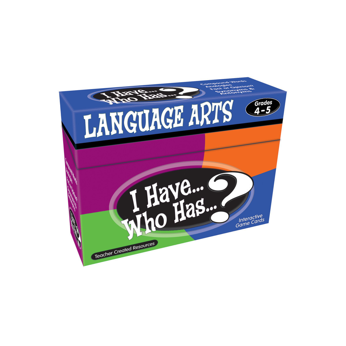 The entire class can have fun while practicing skills in language arts, grammar, vocabulary, spelling, listening, and speaking. Hand out all 37 cards. (Some players may get more than one card.) The student whose card reads, "I have the first card. Who has...?" begins. The student whose card has the answer to that question responds and then asks a different question. This continues until the person with the last card gives the final answer and then reads, "This is the end of the game!" Four sets of game cards included. Game titles include, Analogies, Fact or Opinion?, Compound Words, Synonyms & Antonyms.