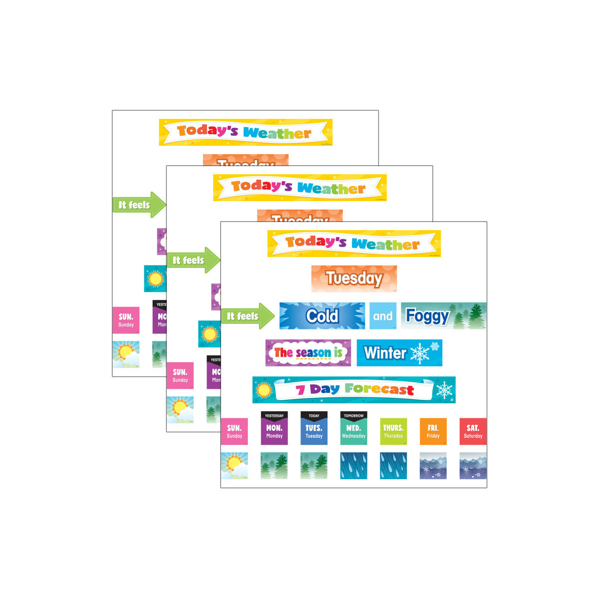 Weather pieces can fit into most pocket charts. Great way for students to learn about the weather. Great for any daycare or classroom setting. Each pack includes 94 total cards: 24 days of the week, seasons, and weather cards (8-3/4" x 2-3/4"), 1 "It feels" arrow (5-1/2" x 2-3/4"), one 7 Day Forecast header (20-3/4" x 2-3/4") and 67 small forecast cards (2-3/4" x 2-3/4"). Sold as 3 packs for a total of 282 cards.