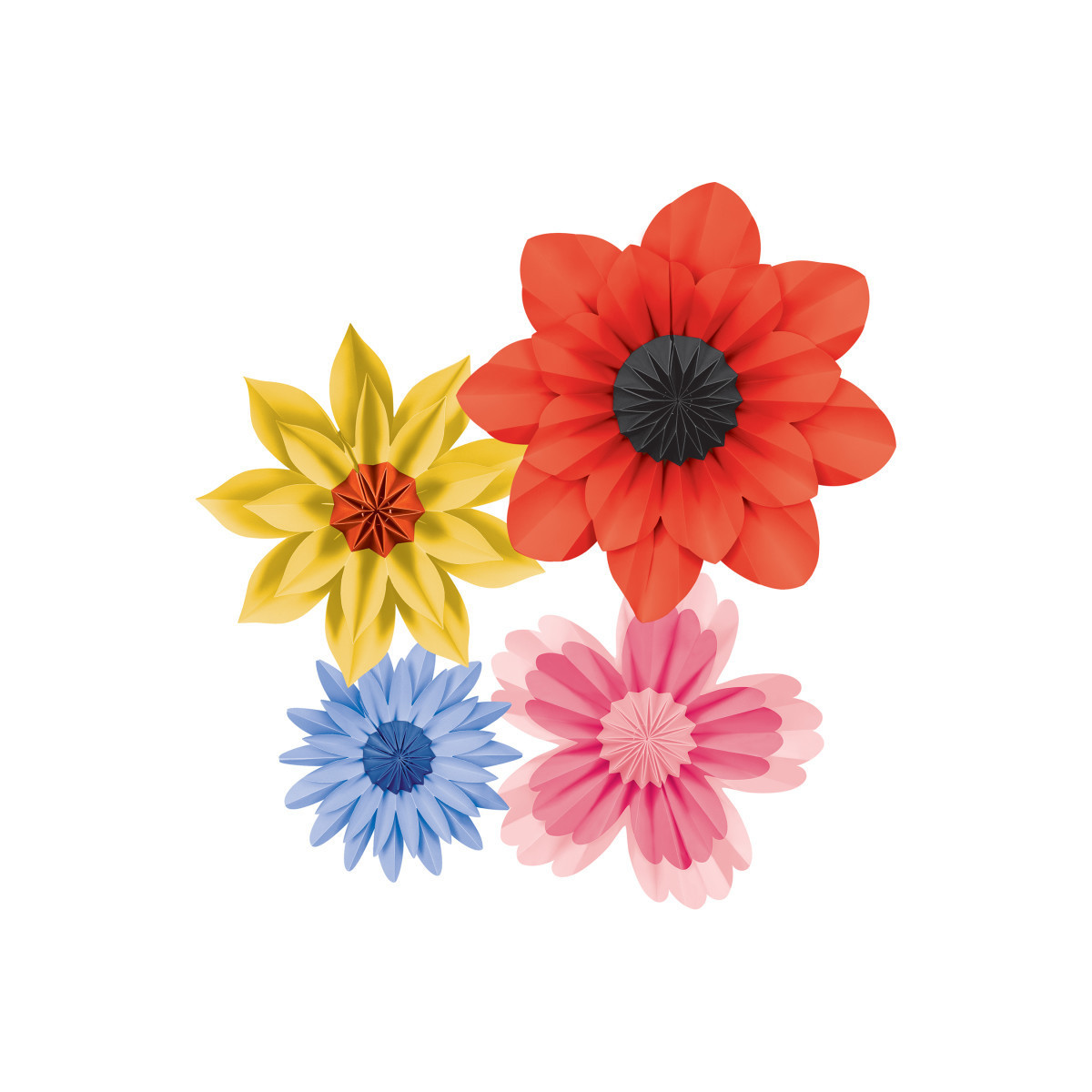 Create a colorful and unique look with these gorgeous paper flowers. Add depth and dimension to walls, backdrops, table decorations, and much more! No assembly required—opens easily and stays together with a hidden magnet. Folds back up for easy storage, so they can be used again and again. Each pack includes 4 flowers: one 16", two 11", and one 8" in diameter.