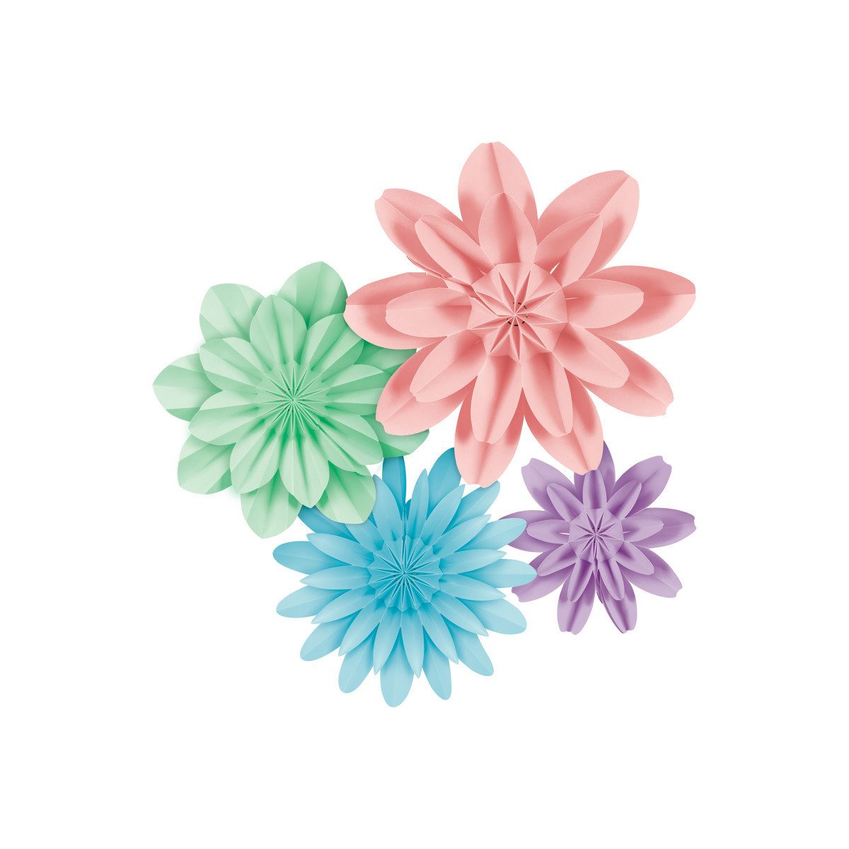 Create a colorful and unique look with these gorgeous paper flowers. Add depth and dimension to walls, backdrops, table decorations, and much more! No assembly required—opens easily and stays together with a hidden magnet. Folds back up for easy storage, so they can be used again and again. Each pack includes 4 flowers: one 16", two 11", and one 8" in diameter.