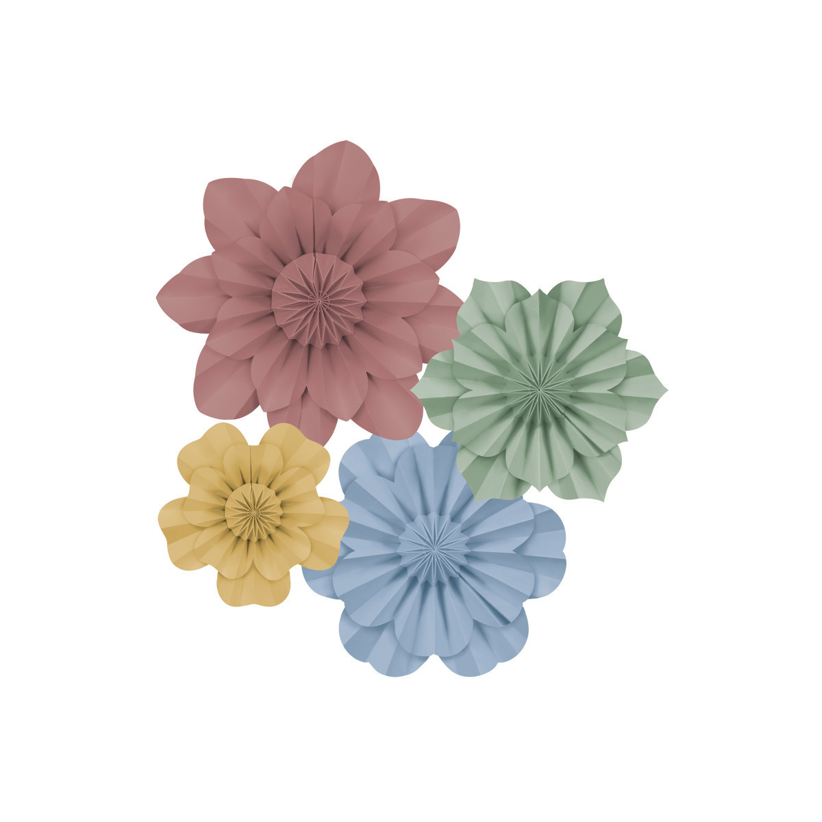 Create a colorful and unique look with these gorgeous paper flowers. Add depth and dimension to walls, backdrops, table decorations, and much more! No assembly required—opens easily and stays together with a hidden magnet. Folds back up for easy storage, so they can be used again and again. Each pack includes 4 flowers: one 16", two 11", and one 8" in diameter.