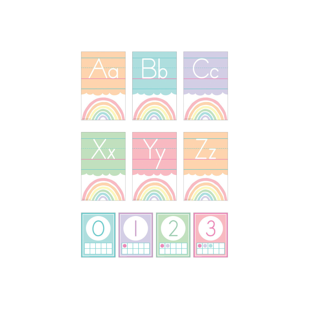 Alphabet cards measure 5-1/2" x 8-1/2" and number cards 0–10 measure 4-1/4" x 5-1/2".