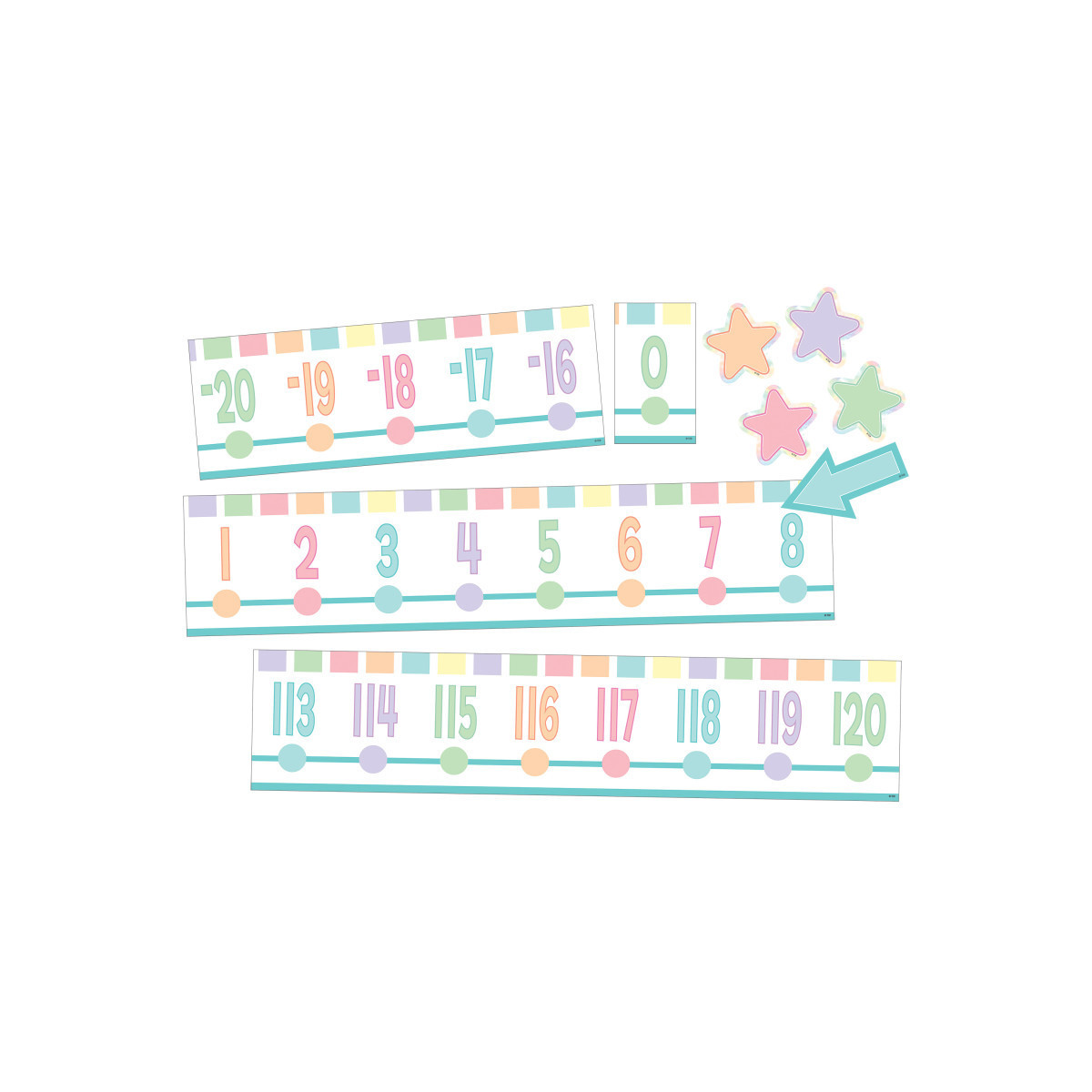 Features: 18 number line pieces, 4 star accents and 1 arrow accent, Bulletin board guide with set-up and activity suggestions, Shiny protective coating for durability