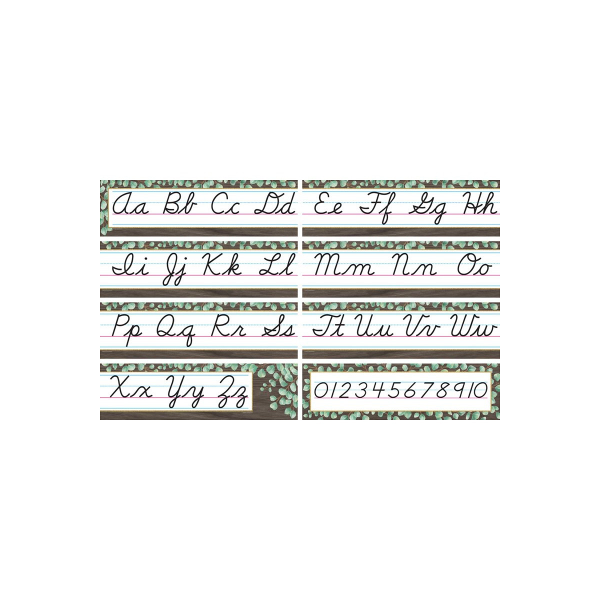 Use this natural wood and greenery bulletin board to display the alphabet and numbers 0-10 as a handy reference for students. Each set includes 8 total pieces.