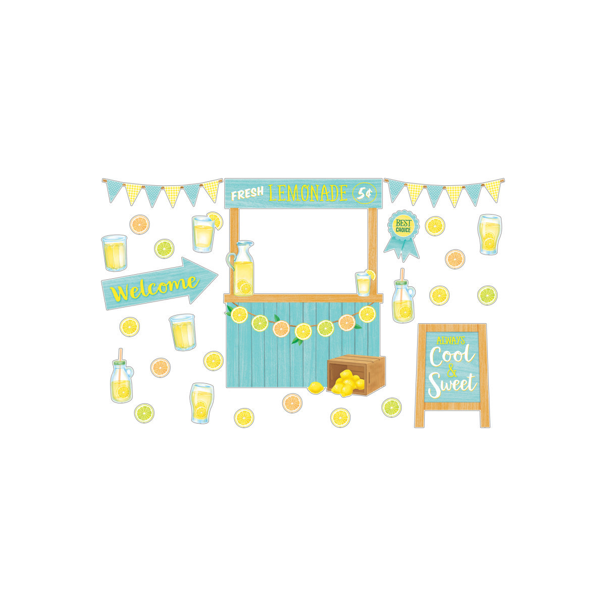 This delightfully refreshing bulletin board adds some zest to your classroom and encourages students to savor the sweetness of each day. Assembled lemonade stand measures about 23-1/2" x 32". Includes 15 accents and 38 lemon slices for names. Includes 55 total pieces.