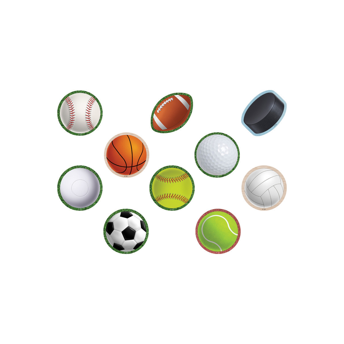 Have fun decorating with these sports accents that measure about 2-5/8". Use them to accent displays, to fill in monthly calendars, or as pieces for learning games like sorting, patterning, and graphing. Each pack includes 36 pieces in 2 colors.