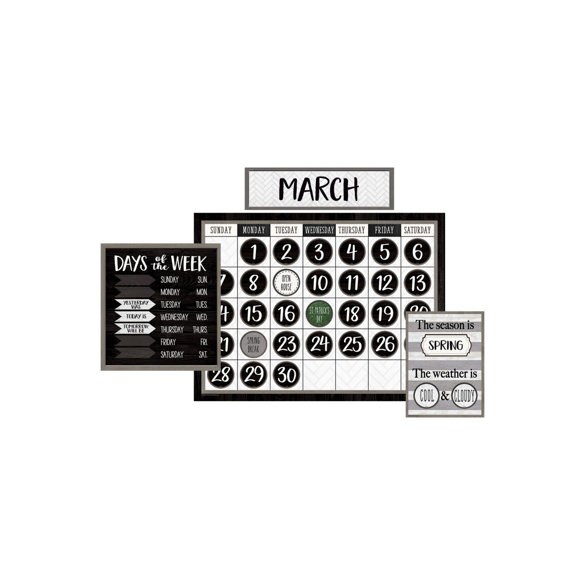 This chic calendar display comes with easy-to-read number pieces, colorful monthly headers, and additional pieces for holidays and special occasions as well as yesterday, today, and tomorrow. Blank calendar measures 24" x 18". 83 total pieces.