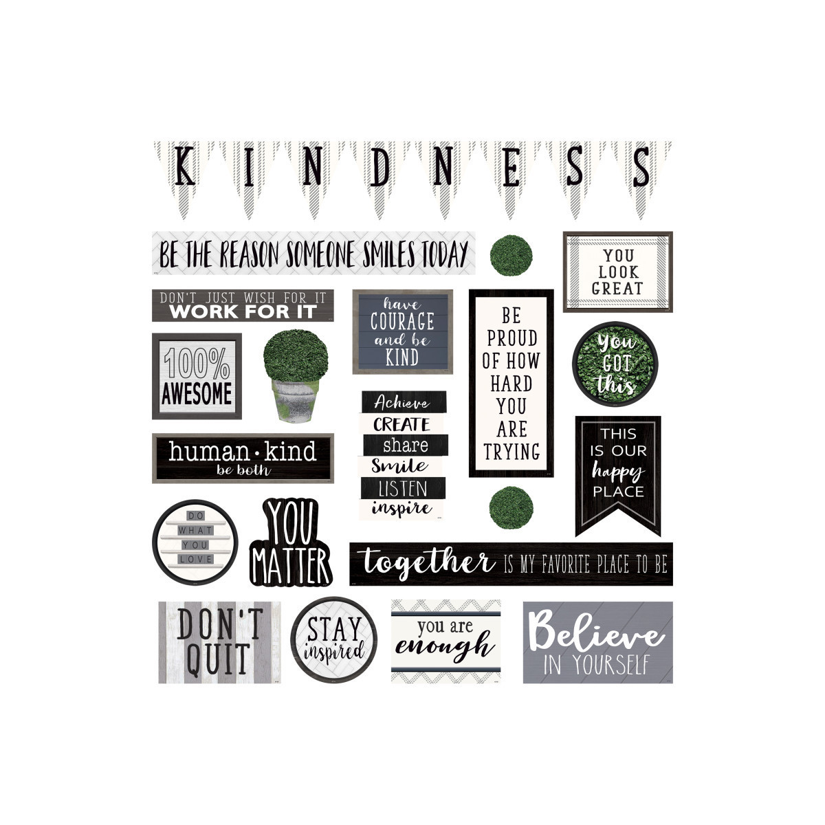 Reinforce positivity and motivation in your classroom with this inspiring and encouraging mini bulletin board. Display the messages together to create a motivational bulletin board display or put them around your classroom to provide students with positive quotes wherever they look. Largest piece measures 20-1/2" x 2-1/4". 28 total pieces.