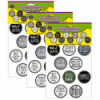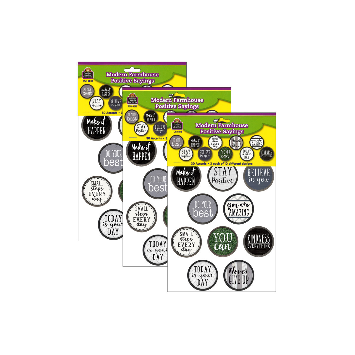 Use these decorative accents to dress up classroom walls and doors, label bins and desks, or accent bulletin boards. Accents are about 6". Each pack includes 30 accents in 10 designs. Sold as 3 packs for a total of 90 accents.