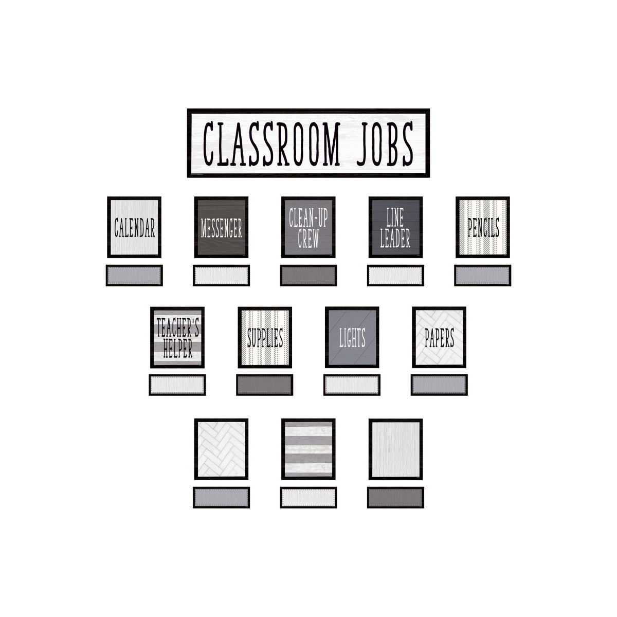 Add a sleek touch to your classroom with this classroom jobs mini bulletin board set in contemporary combos of black, white, and gray. Header piece measures 21" x 6". 49 total pieces.