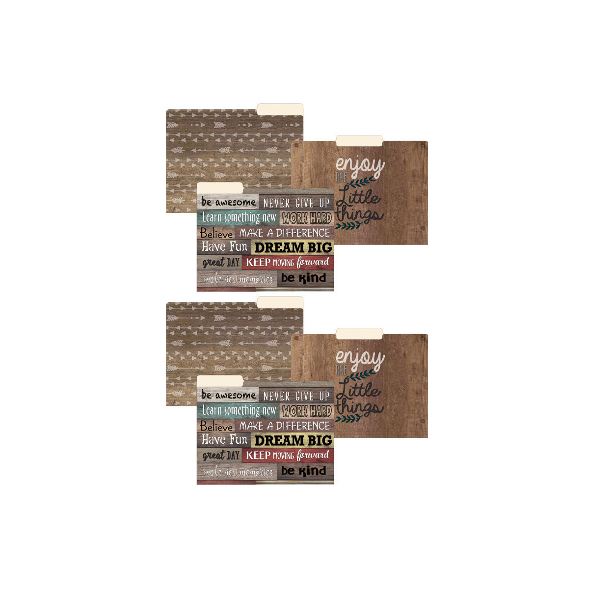Organize your paper work at school or home with these rustic farmhouse chic file folders. File folders measure 11-3/4" x 9-1/2". Each pack includes 12 folders: 4 each of 3 designs. Sold as 2 packs for a total of 24 folders.