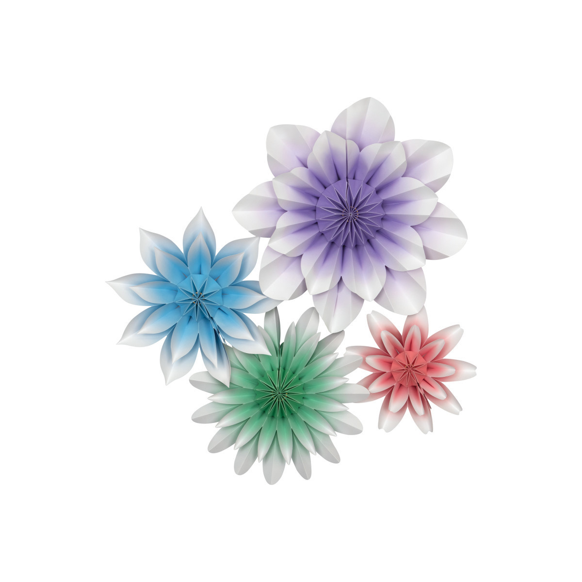 Create a colorful and unique look with these gorgeous paper flowers. Add depth and dimension to walls, backdrops, table decorations, and much more! No assembly required-opens easily and stays together with a hidden magnet. Folds back up for easy storage, so they can be used again and again. Four flowers per pack. Each pack includes one 16" light purple flower, one 11" light blue flower, one 11" mint flower, and one 8" pink flower.
