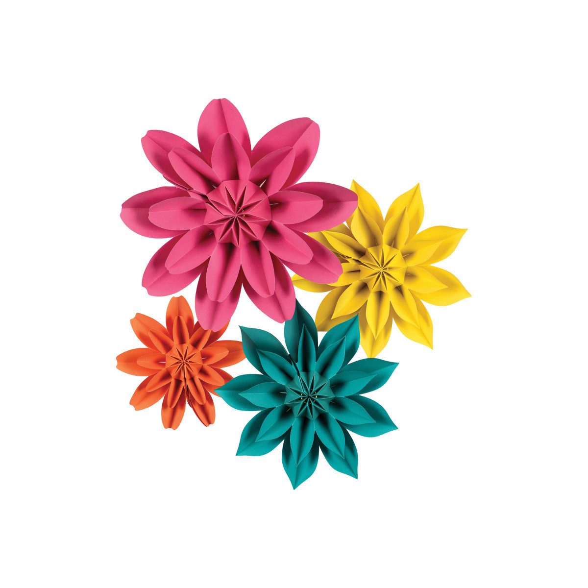 Create a colorful and unique look with these gorgeous paper flowers. Add depth and dimension to walls, backdrops, table decorations, and much more! No assembly required-opens easily and stays together with a hidden magnet. Folds back up for easy storage, so they can be used again and again. Four flowers per pack. Each pack includes one 16" hot pink flower, one 11" yellow flower, one 11" teal flower , and one 8" orange flower.