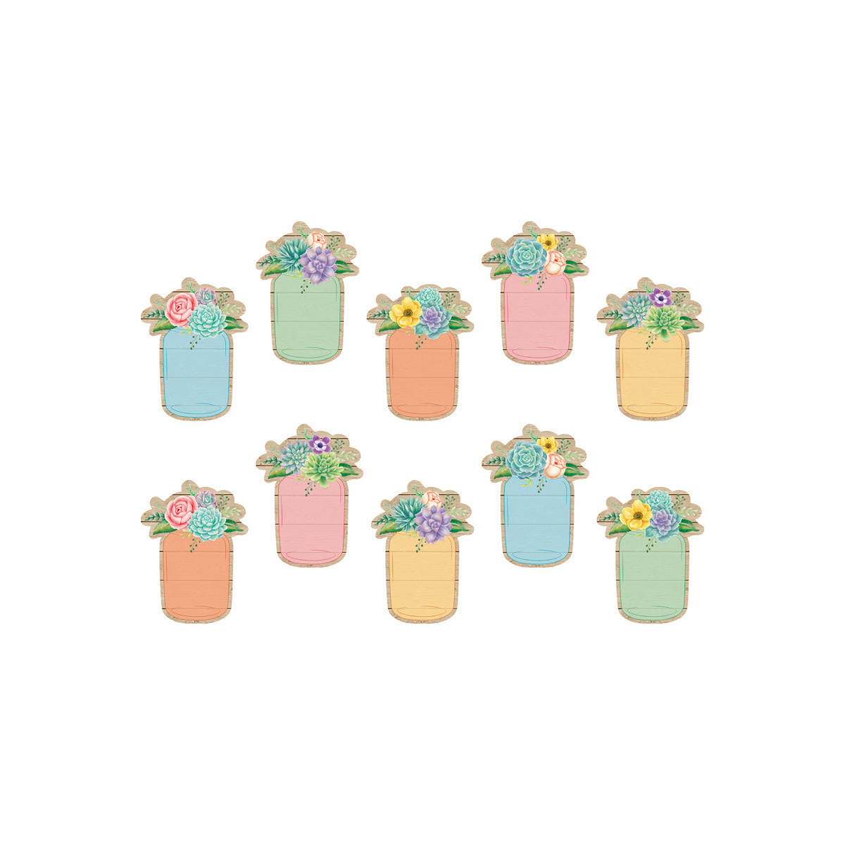 Use these decorative floral mason jars to dress up classroom walls and doors, label bins and desks, or accent bulletin boards. Each accent measures approximately 6". Each pack includes 30 accents in 10 designs.