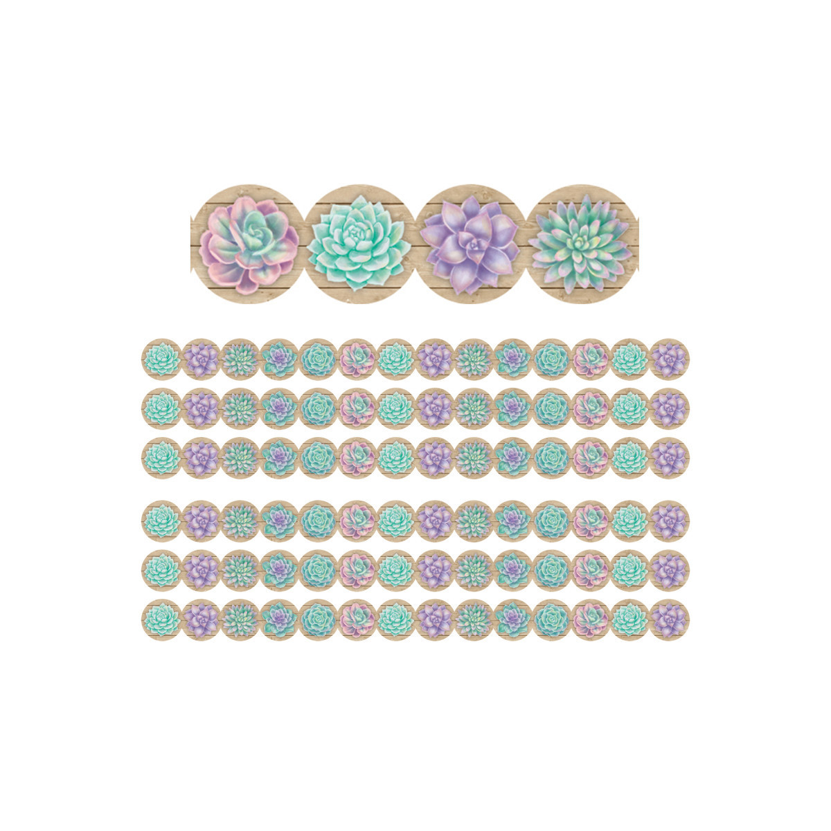 Use Rustic Bloom Succulents Die-Cut border trim to liven up your classroom! Create fresh looks for bulletin boards, windows, walls, and class projects. Mix and match with coordinating products (stickers, notepads, awards, etc.) for a classroom theme. Each pack has 12 pieces (approx. 2¾'' x 35'') for a total length of about 35 feet of trim. Sold as 6 packs for a total of 72 strips (210 feet).