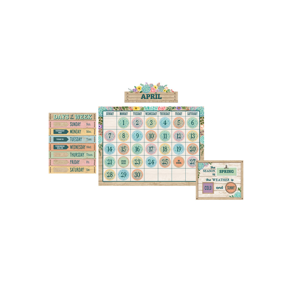This garden-inspired calendar display comes with easy-to-read number pieces, colorful monthly headers, and additional pieces for holidays and special occasions as well as yesterday, today, and tomorrow.