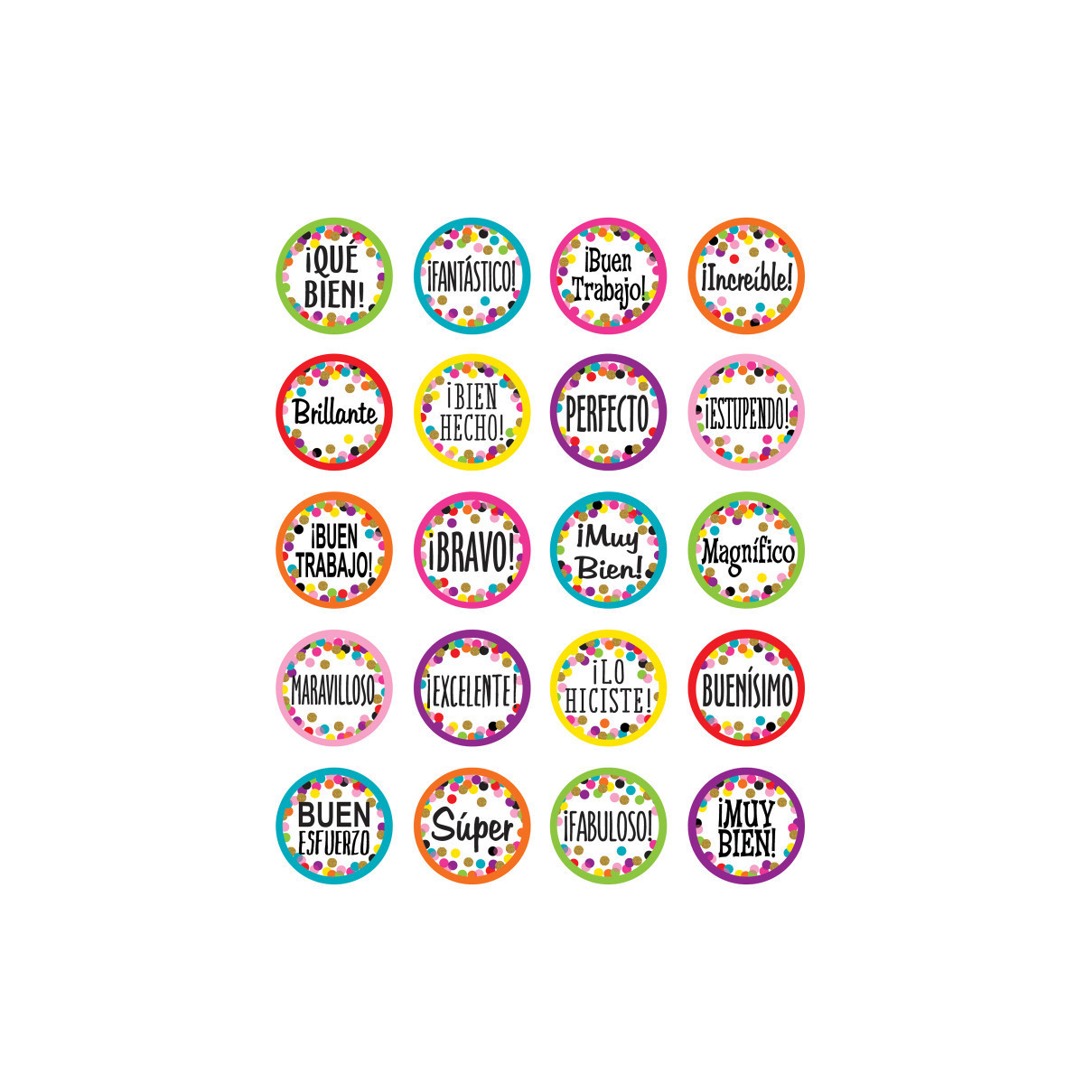 Stickers are great for rewards, encouragement, prizes, arts and crafts, incentive charts and more. Confetti Spanish Stickers are acid-free and lignin-free. Measure approx. 1". 120 stickers per pack.