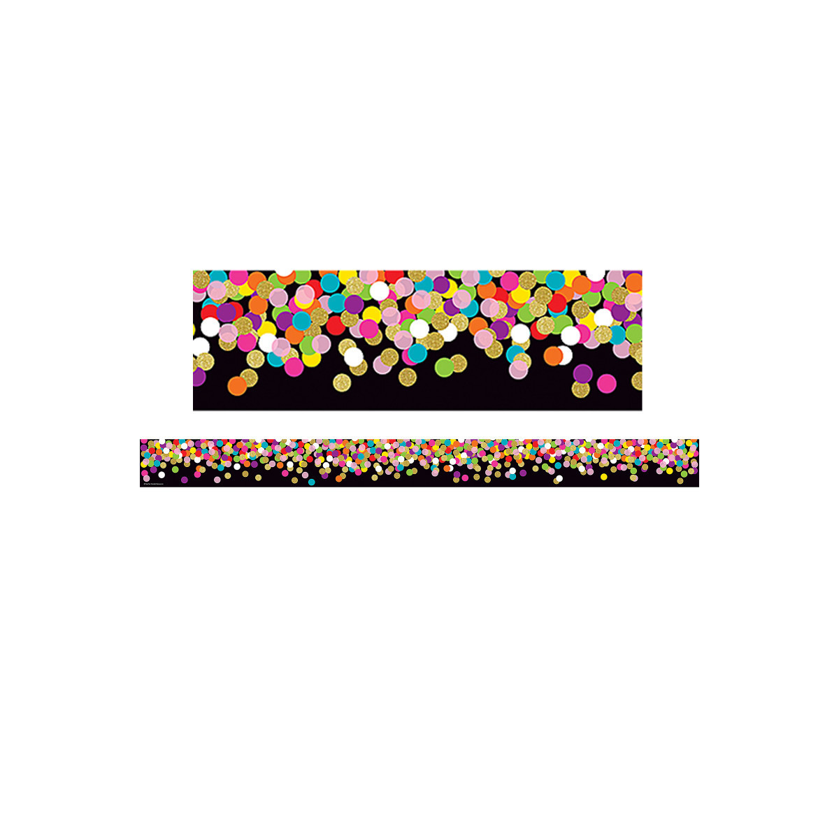Use Colorful Confetti on Black Straight Border Trim to liven up your classroom! Create fresh looks for bulletin boards, windows, walls, and class projects. Mix and match with coordinating products (stickers, notepads, awards, etc.) for a classroom theme. Each pack has 12 pieces (2¾" x 35") for a total length of 35 feet of trim!