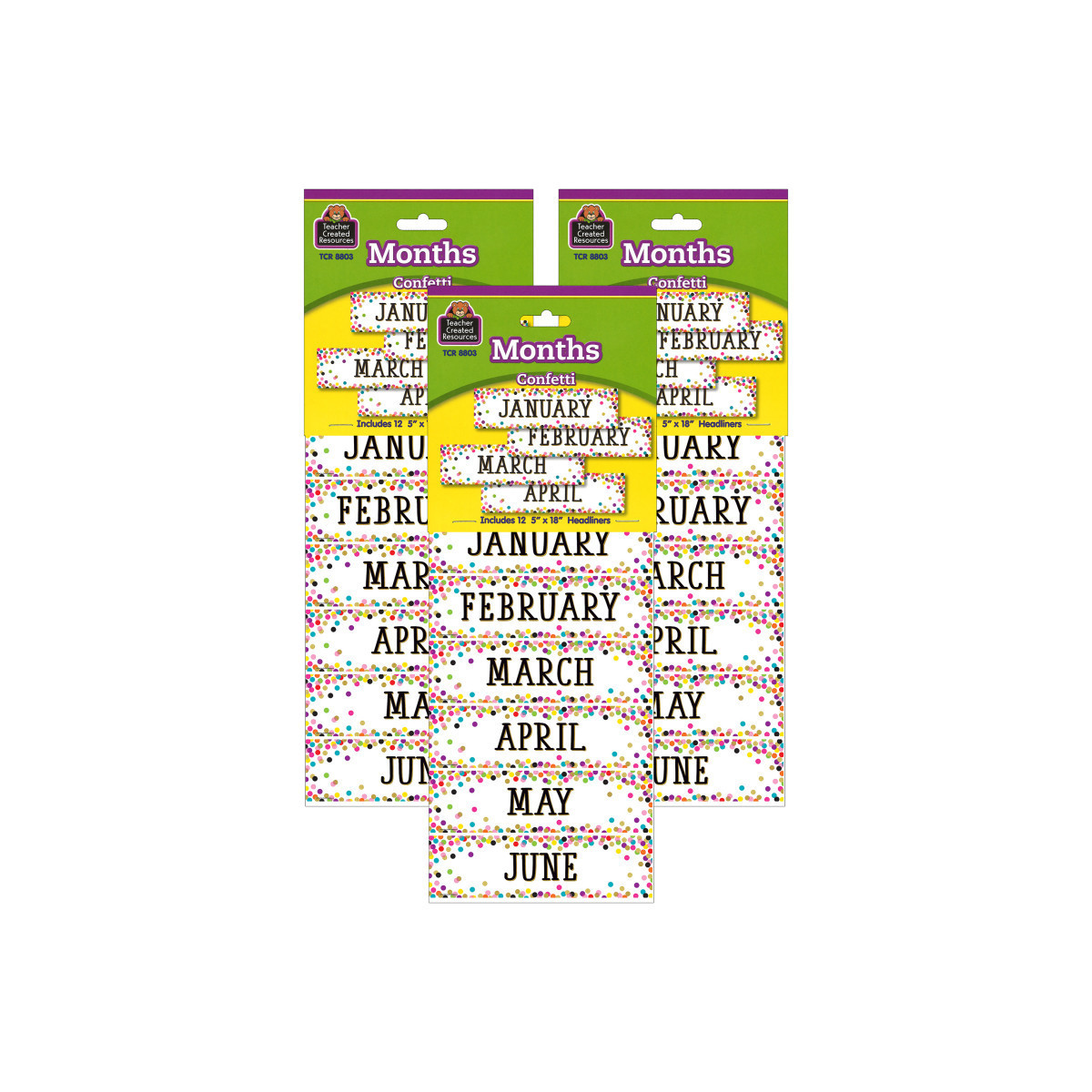 Confetti Monthly Headliners add instant appeal to any classroom! Use them as titles for bulletin board displays. Line them up along a wall or above a chalkboard. Create classroom calendars. 12 headliners per pack. Each headliner measures 5" x 18". Sold as 3 packs for a total of 36 headliners.