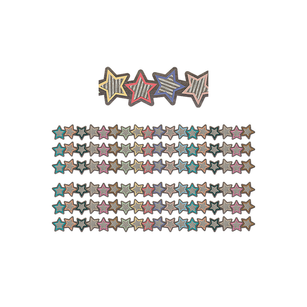 Use this Home Sweet Classroom Stars Die-Cut Border Trim to liven up your classroom! Create fresh looks for bulletin boards, windows, walls, and class projects. Mix and match with coordinating products (stickers, notepads, awards, etc.) for a classroom theme. Each pack includes 12 strips (2.75'' x 35'') for a total length of 35' of trim. Sold as 6 packs for a total of 72 strips (210 feet).