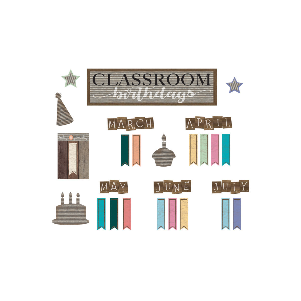 Add some rustic charm to your students' birthdays with this homey bulletin board display. Includes one "Classroom Birthdays" title piece, 12 monthly headers, one "today is your day" sign, three accents, two stars, 39 colorful labels, and a guide with suggestions and activities. Title piece measures 21" x 6". 58 total pieces.