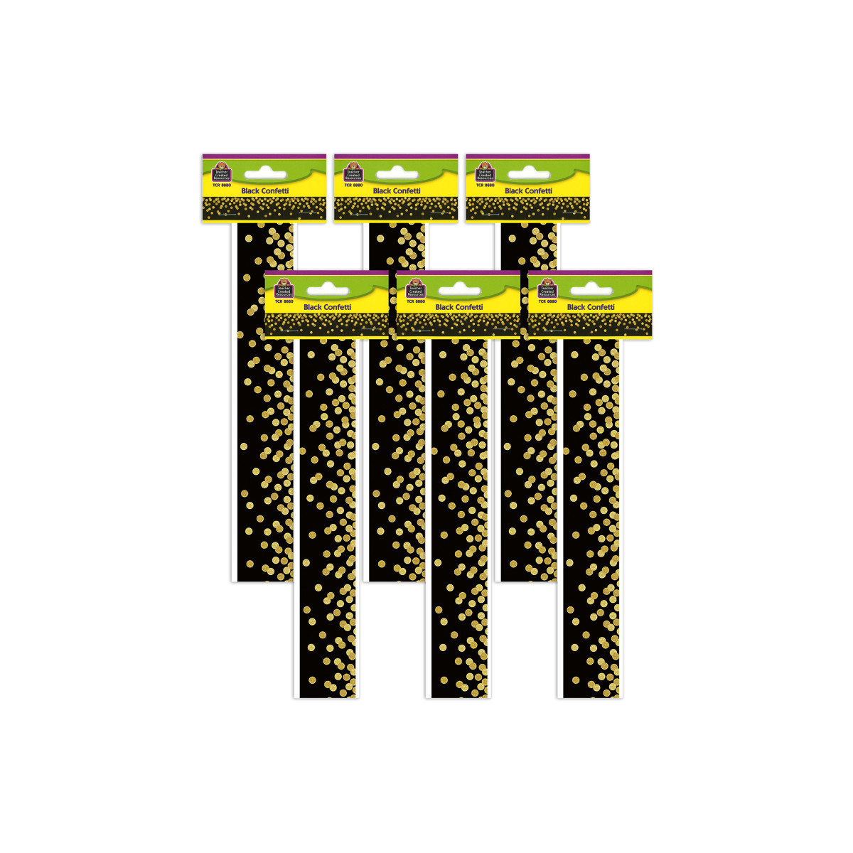 Use Black Confetti Straight Border Trim to liven up your classroom! Create fresh looks for bulletin boards, windows, walls, and class projects. Mix and match with coordinating products (stickers, notepads, awards, etc.) for a classroom theme. Each pack has 12 pieces (3'' x 35'') for a total length of 35 feet of trim. Sold as 6 packs for a total for 72 strips (210 feet).