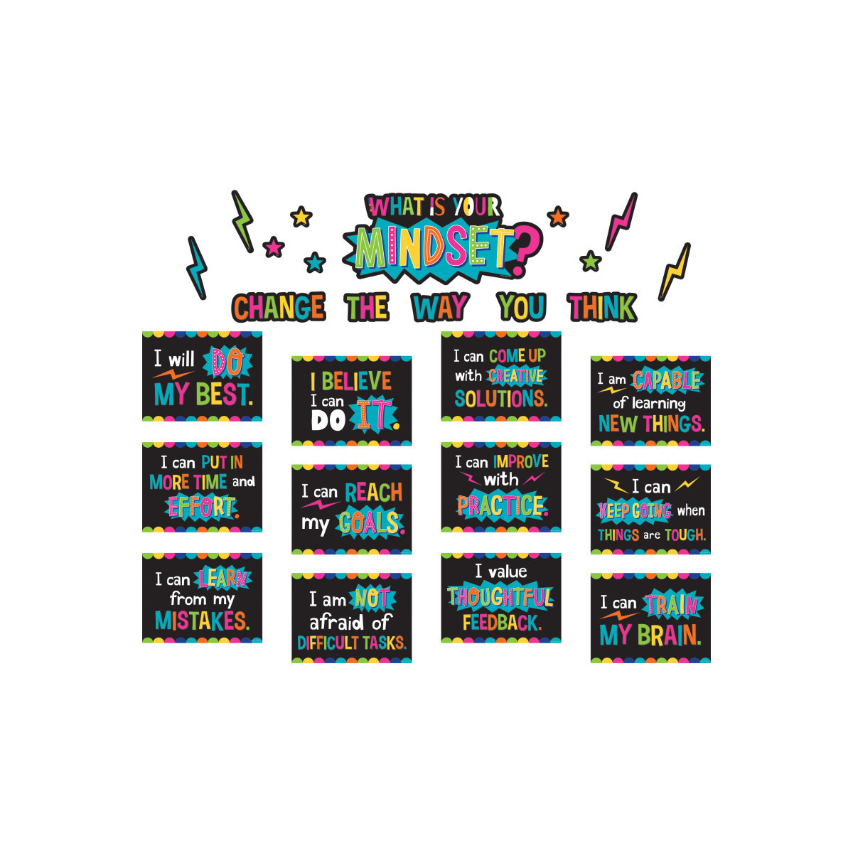 Teach students about the power of positivity with this growth mindset bulletin board. This colorful bulletin board is a great visual reminder for students that changing their thoughts and words can have a big impact on end results. Each of the 12 posters measures 12" x 9" and includes a positive statement designed to build self-confidence and encourage student achievement. The "What is Your Mindset?" header piece measures 20" x 9.25". 28 total pieces.