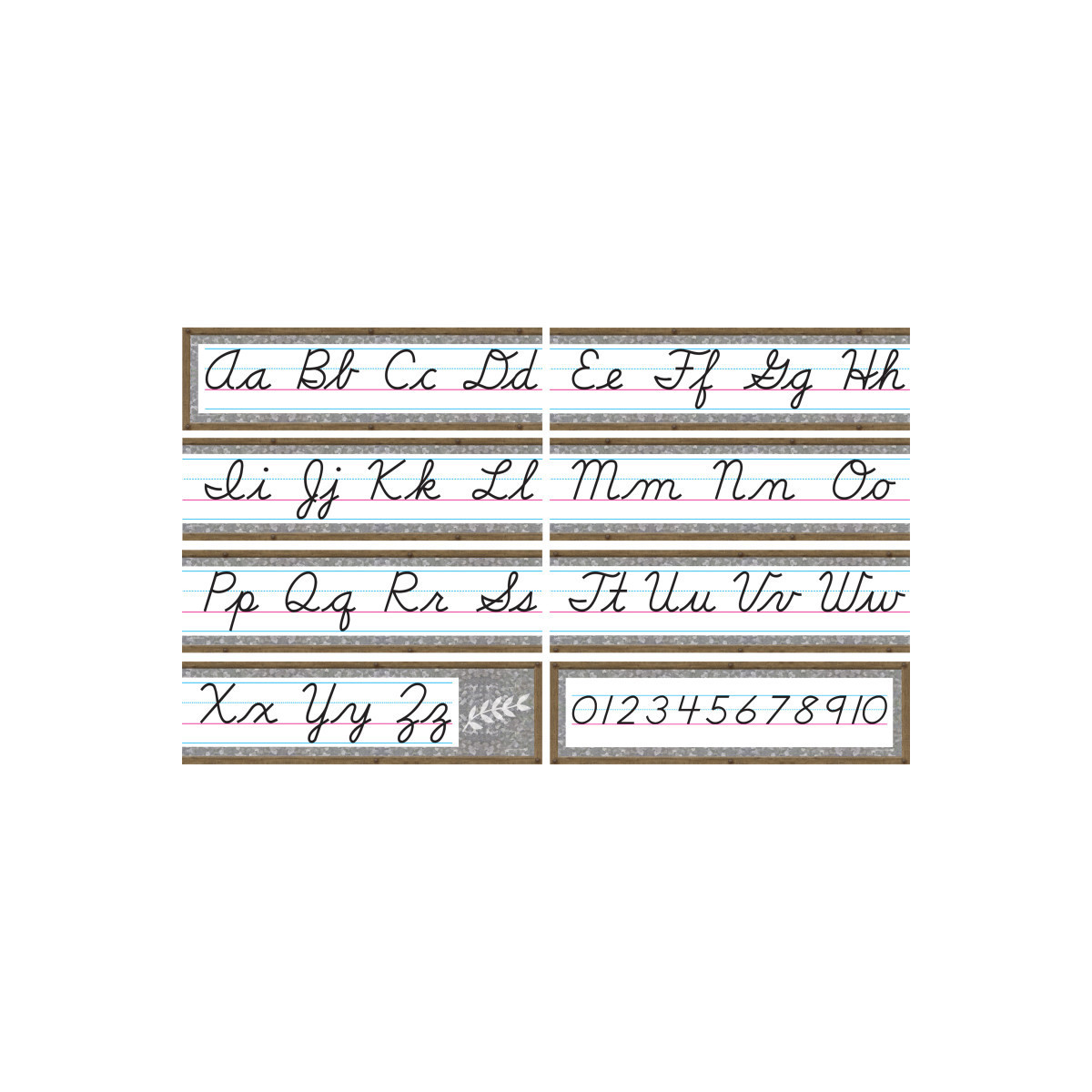 Display the Home Sweet Classroom Cursive Mini Bulletin Board alphabet and numbers 0-10 as a handy reference for young students. The 4-page teacher's guide includes writing tips and a reference chart that diagrams the steps in writing each letter. Includes 8 panels for a 14-foot long alphabet line. Shiny, protective coating adds durability. This product is acid-free per industry standards. Each piece is 21" x 6".