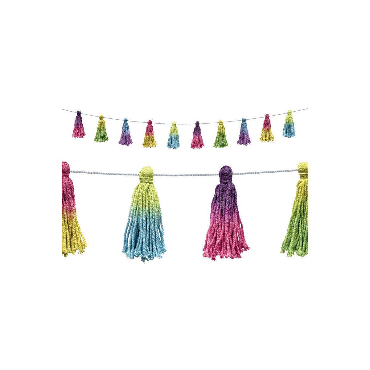 Instantly brighten any space with fun and festive garland. Each garland will add the perfect splash of color to your home or classroom, or use it to celebrate any special occasion. Each garland measures 60 inches in length. Pom-poms are approximately 1-1/2" in diameter. Tassels are approximately 5" in length. Features 10 tassels.