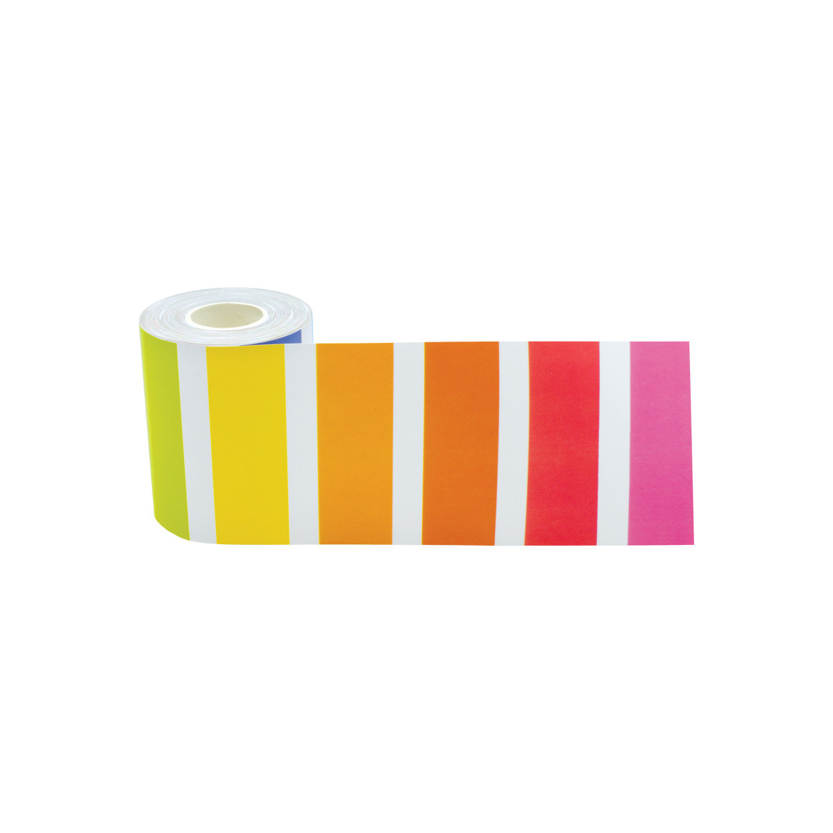 50 foot continuous roll of vibrant border trim made of durable paper.