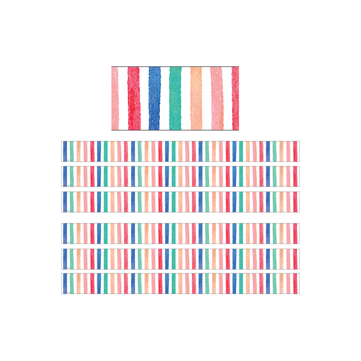 Use colorful border trim to liven up your classroom! Create fresh looks for bulletin boards, windows, walls, and class projects. Mix and match with coordinating products (stickers, notepads, awards, etc.) for a classroom theme. Each pack has 12 pieces (3'' x 35'') for a total length of 35 feet of trim. Sold as 6 packs for a total of 72 strips (210 feet).