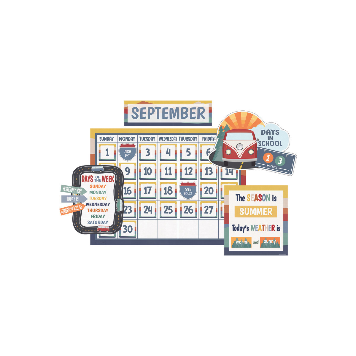 Bring a touch of wanderlust to your classroom or home with this vibrant and educational calendar display. With easy-to-read number pieces, colorful monthly headers, and additional pieces for holidays and special occasions, this calendar is both functional and visually appealing. Count the days of the school year, track the weather and seasons, and learn the days of the week with the included pieces. Measuring 24" x 18", the blank calendar comes with 110 total pieces, including a guide with set-up and activity suggestions for added convenience. Durable and protective coating ensures long-lasting use, making this calendar display a must-have for any learning environment.