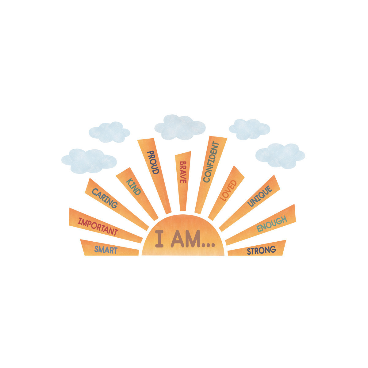 - 17 Pieces Total: This set includes 17 pieces, including a “I Am" sun piece, 11 sun rays, and 5 cloud accents for a complete bulletin board display.