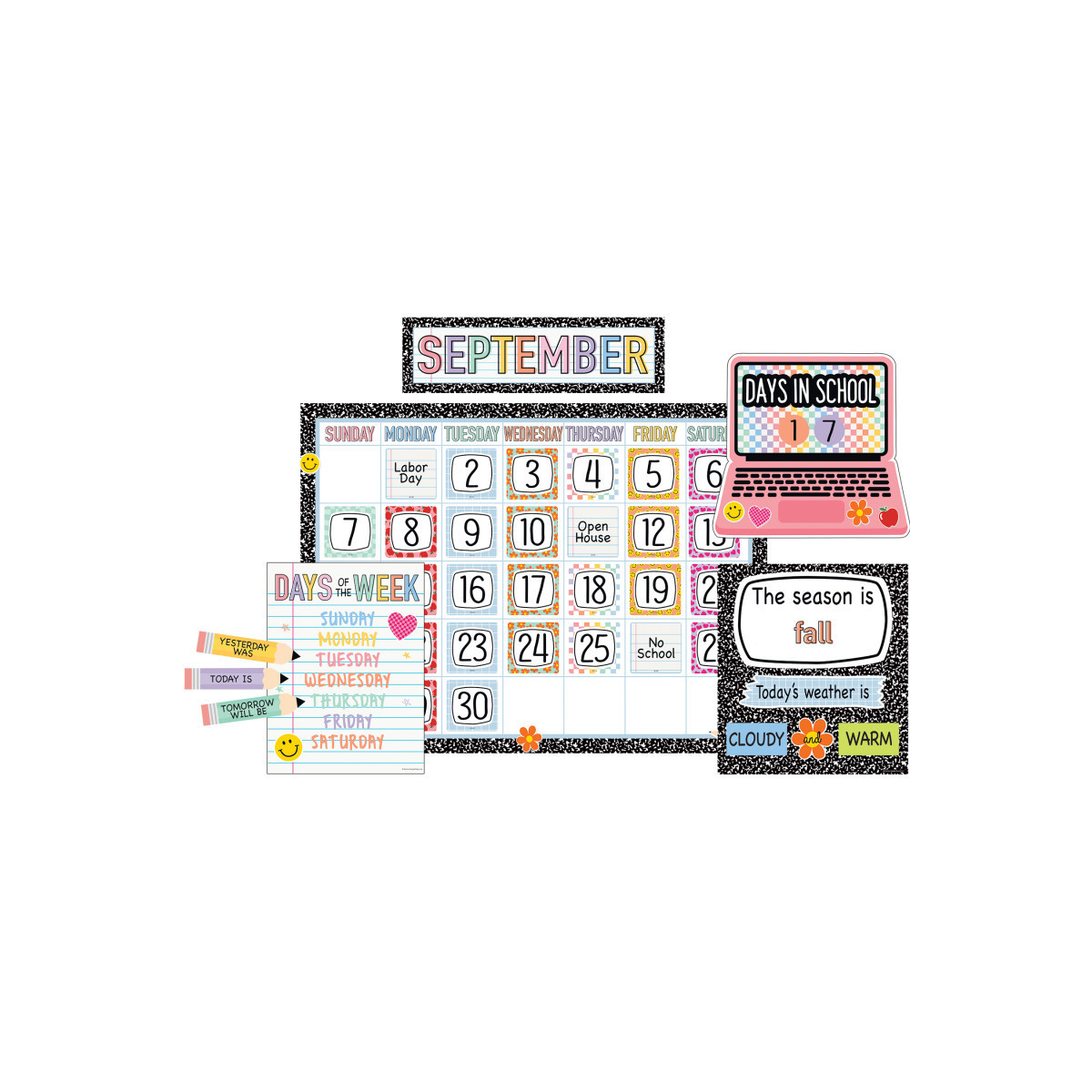 - This calendar display comes with easy-to-read number pieces, colorful monthly headers, and additional pieces for holidays and special occasions. It also includes pieces for counting days of the school year, the weather, seasons, and days of the week as well as for “yesterday”, “today”, and “tomorrow”.