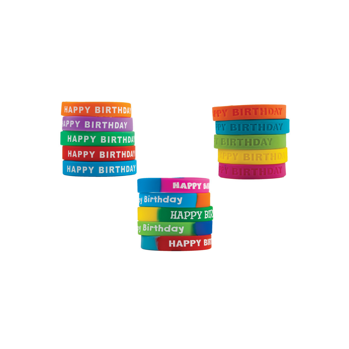 Build awareness for special people or events with these two-toned wristbands made of silicone. This set contains 30 Happy Birthday wristbands. Latex Free. Tested and compliant with all Consumer Product Safety Commission standards. Circumference measures 7.25".