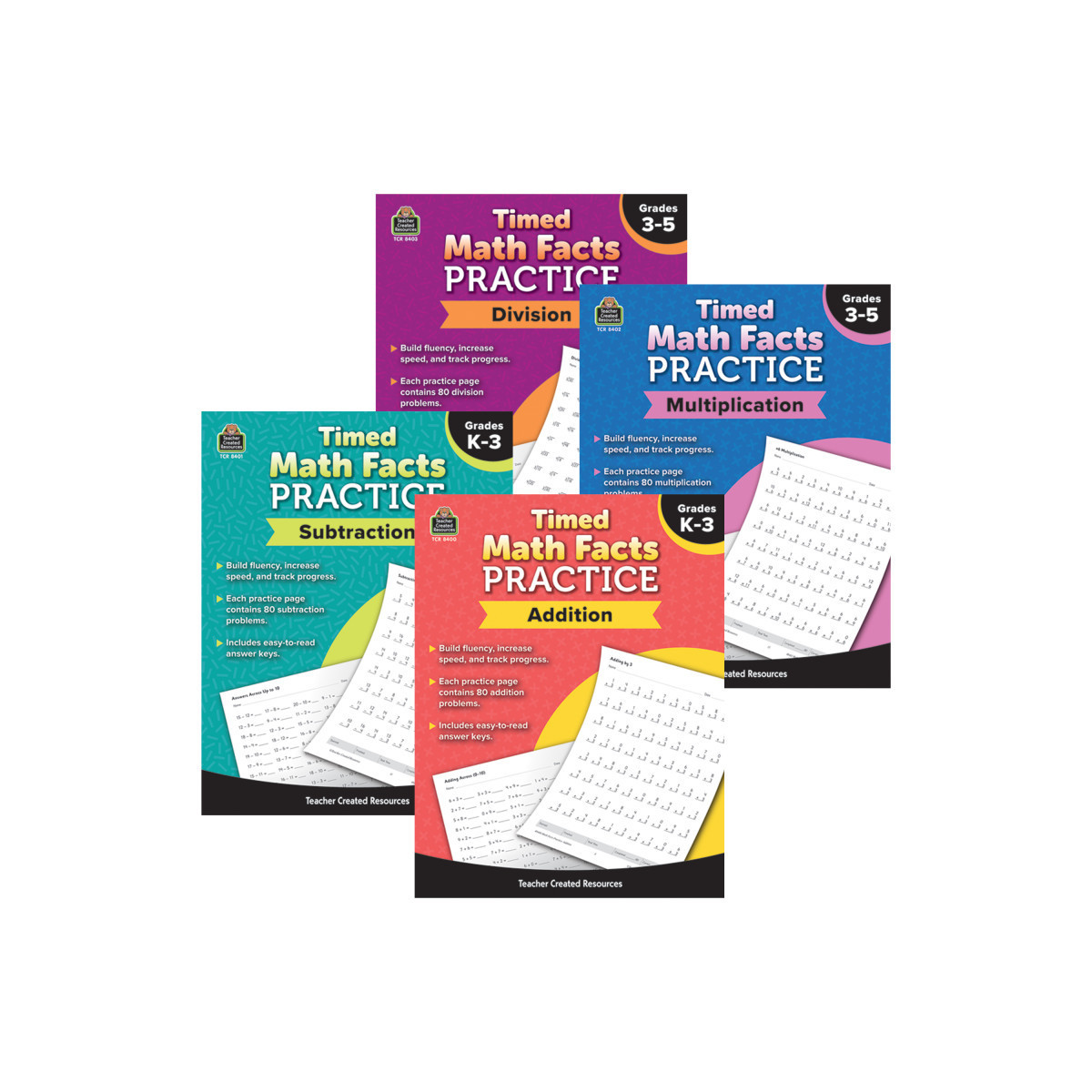 Build fluency, increase speed, and track progress with this timed math facts practice. These books will help students gain fluency, flexibility, confidence, and speed in solving addition problems, and each unique page offers another opportunity to practice and improve. Tracking sheets make monitoring progress easy, and easy-to-check answer keys are included for every practice page. Each book includes 64 pages. This set includes 4 books: Addition, Subtraction, Multiplication and Division.
