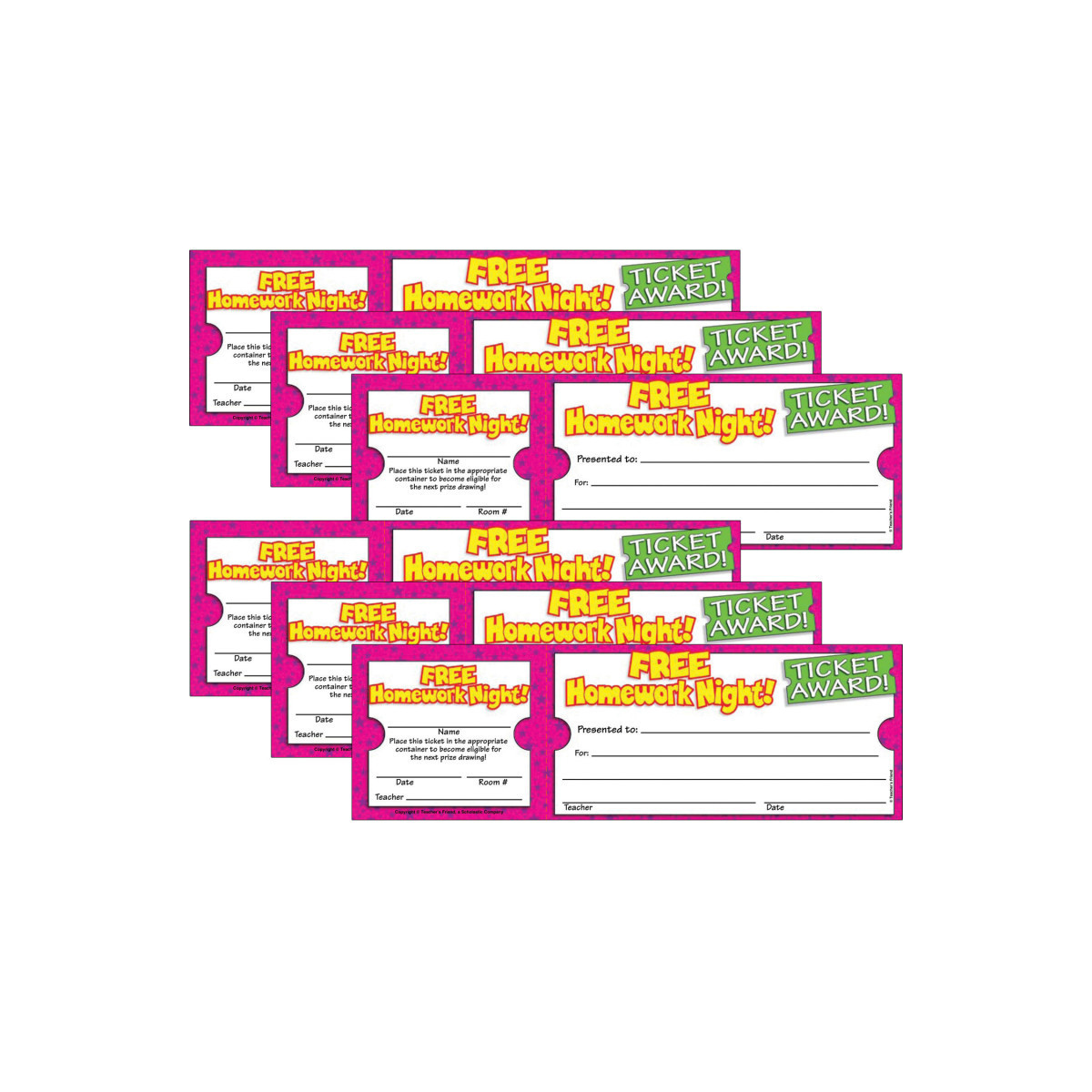 These clever Ticket Awards are padded for easy use. Each award is perforated into two parts. One part is filled out by the teacher and the student takes it home to show parents. The second part is signed by the student and placed in a container for a chance of a prize in a classroom or school-wide drawing! A wonderful way to give positive reinforcement! Each ticket measures 8 1/2" x 2 3/4". Each pack includes 100 awards. Sold as 6 packs for a total of 600 awards.