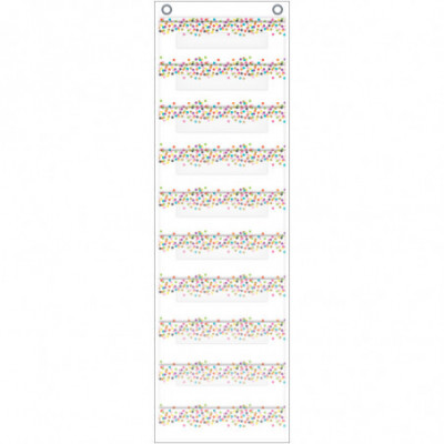 Pocket chart features a storage pocket for cards and straws
