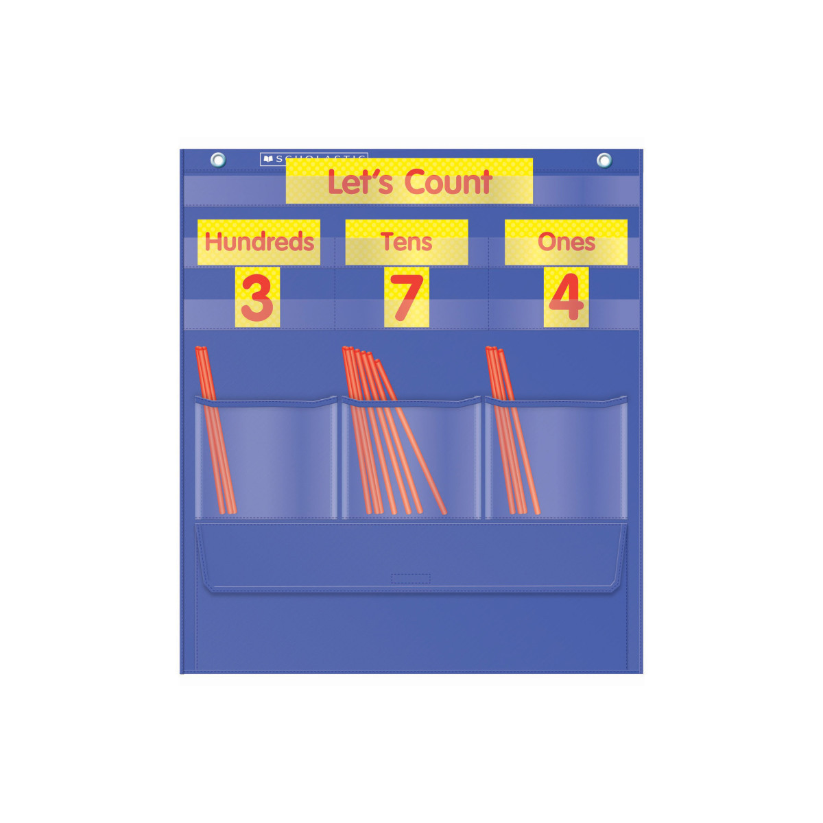 Two-color cards include 3 place-value cards, 30 number cards, and 1 title card. Also includes 200 plastic straws, plus a 2-page activity guide. Pocket chart features a storage pocket for cards and straws.