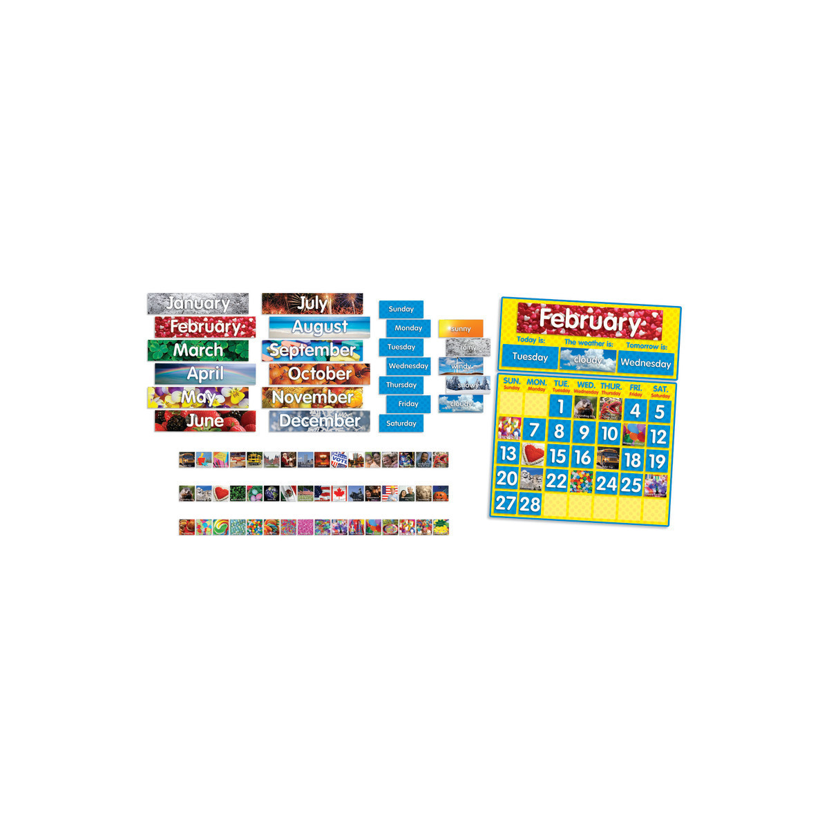 Bright, colorful photographs make this highly engaging calendar a must-have in every classroom! Includes a large, blank calendar frame, 12 monthly labels, 7 day-of-the-week cards, 33 date cards, 48 special day cards, and 5 weather cards. Includes an activity guide.