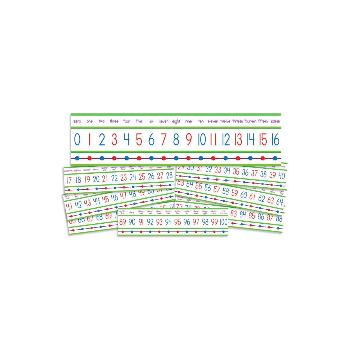 Use this 16-foot-long number line to teach counting, skip counting, odd and even numbers, number words, and more! Includes 1 Number Line 0-100, 16 feet long.