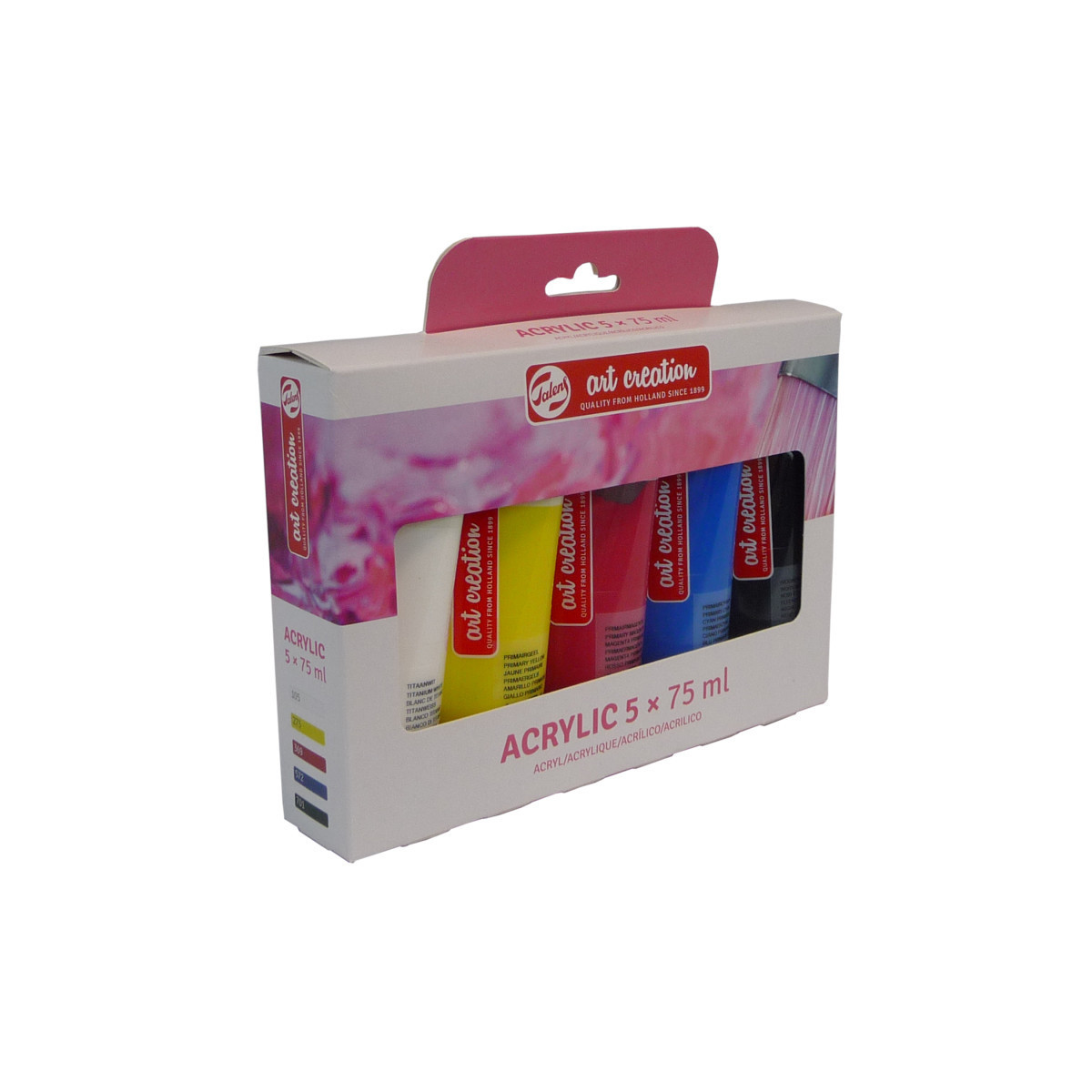 This acrylic color set offers a great basic palette of colors to create various paintings with. These bigger tubes of common colors are great to have in your collection! Contents: 5 x 75 ml tubes (105 Titanium White – 275 Primary Yellow – 369 Primary Magenta – 572 Primary Cyan – 701 Ivory Black). Talens Art Creation acrylic color is a reliable quality acrylic paint based on acrylic resin. The paint has a pasty consistency, dries quickly and has a silky gloss when dry. These acrylic colors can be used both straight from the tube and thinned with water and are waterproof when dry. The colors are easy to mix with one another and easy to use due to their dosing cap. This versatile paint can be used on almost any surface, as long as it is somewhat absorbent and free of grease and dust. From canvas and paper to plaster, board, wood, stone and cement. Since the tubes are transparent, you can easily pick the color you want to use while painting.