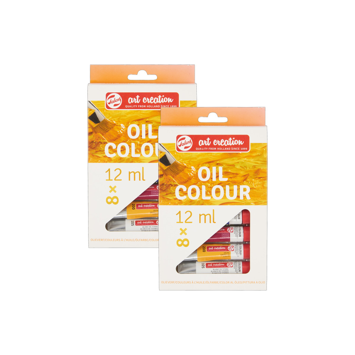 This oil color set offers a great basic palette of colors to create various paintings with. With their convenient size, these tubes are ideal to have in your studio or to take with you while you travel. Each set includes 8 x 12 ml tubes (105 Titanium White – 200 Yellow – 318 Carmine – 504 Ultramarine – 662 Permanent Green – 227 Yellow Ochre – 409 Burnt Umber – 701 Ivory Black). Talens Art Creation oil color is a versatile type of paint that you can use both thin and very pasty. The paint is made of pigments and vegetable oil and offers intense colors. These oil colors are suitable for all oil painting techniques, such as wet on wet, layered painting and glazing. Oil paints are known for their slow drying time.