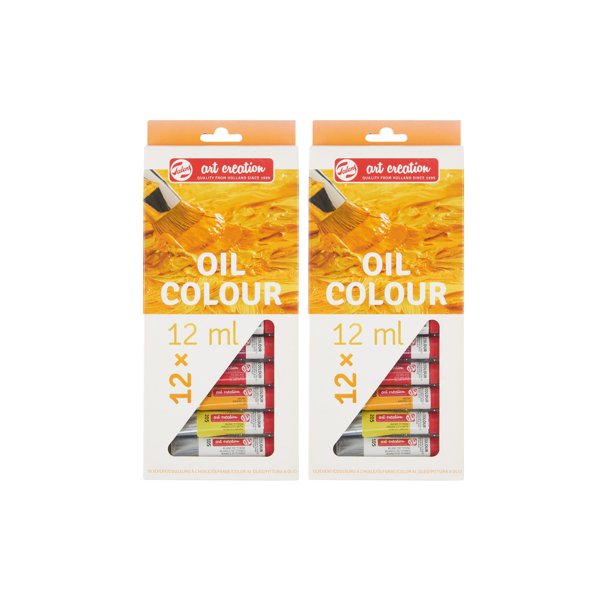 This oil color set offers a great basic palette of colors to create various paintings with. With their convenient size, these tubes are ideal to have in your studio or to take with you while you travel. Each set includes 12 x 12 ml tubes (105 Titanium White – 205 Lemon Yellow (Primary) – 200 Yellow – 334 Scarlet – 318 Carmine – 504 Ultramarine – 530 Sèvres Blue – 662 Permanent Green – 227 Yellow Ochre – 411 Burnt Sienna – 409 Burnt Umber – 701 Ivory Black). Talens Art Creation oil color is a versatile type of paint that you can use both thin and very pasty. The paint is made of pigments and vegetable oil and offers intense colors. These oil colors are suitable for all oil painting techniques, such as wet on wet, layered painting and glazing. Oil paints are known for their slow drying time. This means the paint allows you to continue correcting and painting for a long time, it dries exactly as applied with sharp brush strokes and no volume loss or change in color. With oil colors, you know exactly what the end result will be! Sold as 2 sets for a total of 24 tubes.