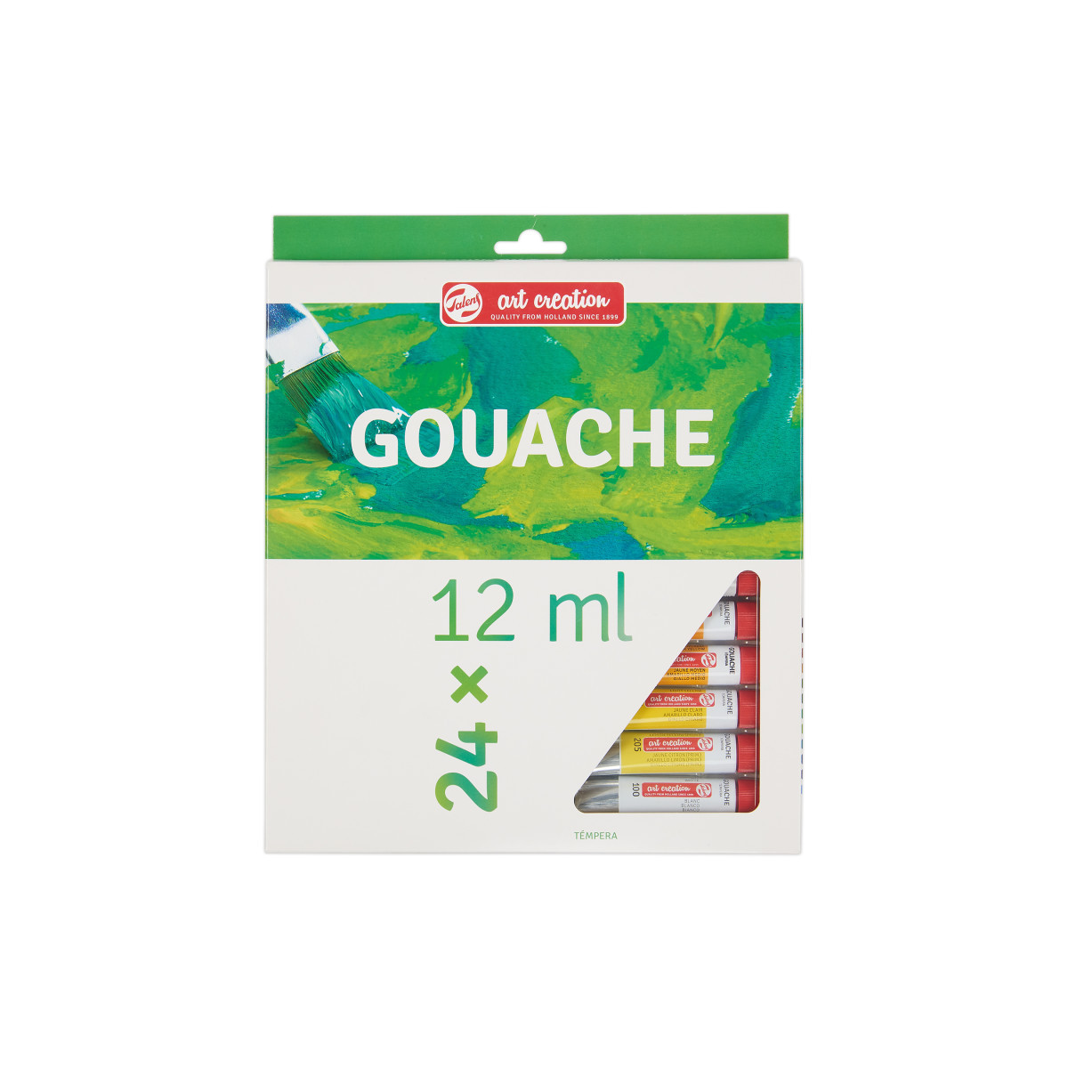This gouache set offers a great basic palette of colors to create various paintings with. Because of their convenient size, these tubes are ideal to have in your studio or to take with you while you travel. Contents: 24 x 12 ml tubes (100 White – 205 Lemon Yellow (Primary) – 201 Light Yellow – 293 Medium Yellow – 202 Deep Yellow – 374 Pink Beige – 311 Vermilion – 334 Scarlet – 318 Carmine – 362 Deep Rose – 536 Violet – 504 Ultramarine – 512 Cobalt Blue (Ultramarine) – 508 Prussian Blue – 501 Light Blue (Cyan) – 526 Azure Blue – 617 Yellowish Green – 601 Light Green – 602 Deep Green – 623 Sap Green – 227 Yellow Ochre – 411 Burnt Sienna – 409 Burnt Umber – 700 Black). Talens Art Creation gouache is an opaque paint that you can thin, mix and blend with water. Gouache allows you to paint matt sections without leaving stripes or brush strokes. Because this paint dries within several minutes, it is highly practical and easy to use for large color blocks and fine details. Gouache is not waterproof when dry, so you can still rework the paint with a little water on your brush. The paint can be used on many grounds, such as paper, canvas, cardboard and wood. Gouache is known for its color intensity, which has made the paint popular among artists, designers and illustrators